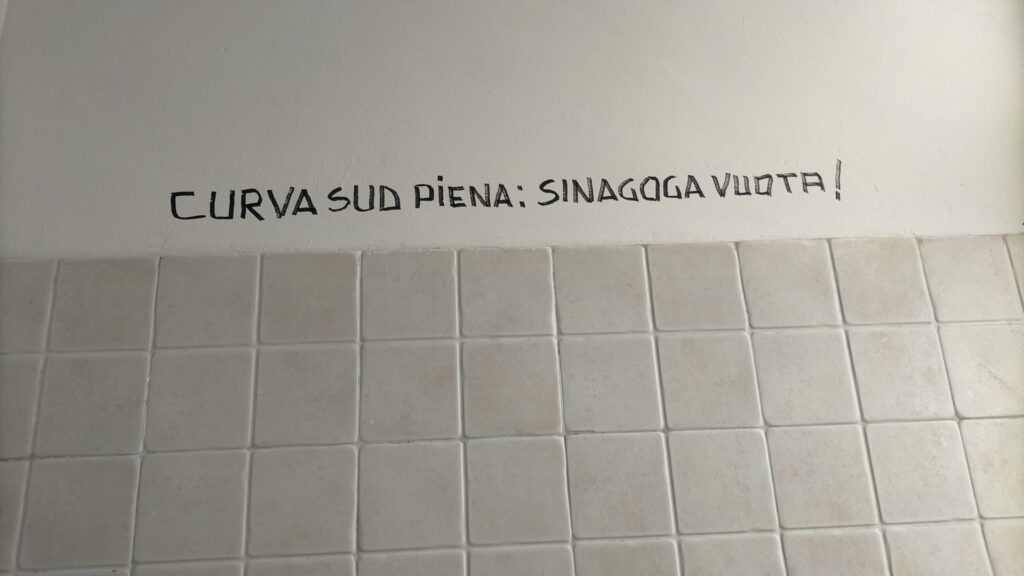 Stampa 10 Ottobre 2023 Roma, scritta antisemita alla Sapienza Luogo: Roma Fonte: Segnalazione CE “Curva sud piena, sinagoga vuota!” Scritta trovata in un bagno dell’Università Sapienza a Roma: “Curva sud piena, sinagoga vuota!”