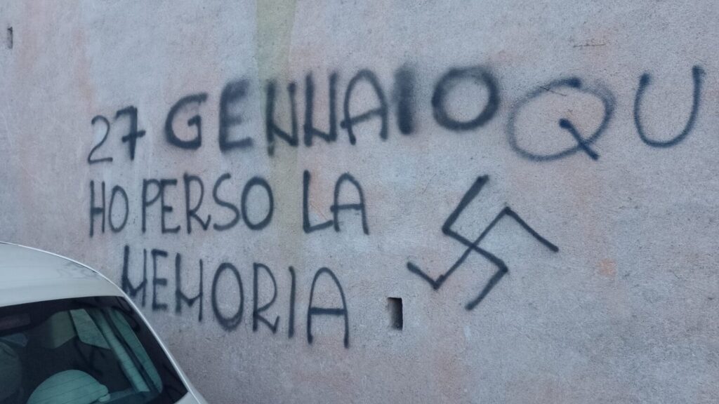Con una bomboletta spray nera, sul muro, è stata riprodotta una svastica e si legge: “27 gennaio, quando ho perso la memoria”. La strada su cui è comparsa la scritta dista circa 500 metri in linea d’aria dal Monumento alla Memoria, in via Antonio Labranca, e che nel quartiere ricorda le vittime dell’incursione nazista del 4 giugno del 1944, quando morirono quattordici persone, tra cui il sindacalista Bruno Buozzi.