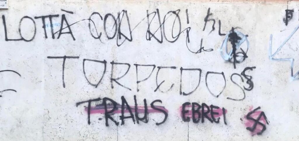 Verosimilmente qui i “trans”, l’oggetto della diffamazione, sono i transgender, le persone che la Treccani definisce come “chi si identifica in modo transitorio o persistente con un genere diverso da quello assegnato alla nascita”. L’iniziale ”T” entra a far parte di quella complessa sigla LGBTQ+ che indica l’insieme delle persone che non aderiscono al binarismo sessuale o di genere. Sigla un po’ difficile da ricordare e scrivere, e allora si semplifica con “trans”. Una categoria che l’anonimo writer vuole additare al pubblico disprezzo e per farlo non trova di meglio che associarli a quello che per lui è un epiteto ingiurioso, di comune uso nelle tifoserie: “ebrei”. Apparentemente non ci sarebbe nulla di speciale in questa ennesima esternazione, ma la sua forma ha qualcosa di nuovo e intrigante e merita un commento. Intanto bisogna tener presenti due dati: che esistono effettivamente ebrei transgender, anche nella comunità romana, ma questo non vuol dire che i “trans” siano ebrei o che gli ebrei siano “trans”; e che d’altra parte l’ebraismo normativo, la halakhà, non approva le azioni che vengono fatte di chi porta all’estremo la sua scelta di genere, con l’abbigliamento, i trattamenti ormonali e quelli chirurgici. Ma il problema non è questo ora, quanto la complessità simbolica che la “geniale” sintesi della scritta del writer evoca.