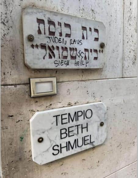 Nella notte tra sabato 7 e domenica 8 giugno, ignoti hanno imbrattato con scritte antisemite l’ingresso del Tempio Beth Shmuel, in via Garfagnana, nei pressi di piazza Bologna a Roma. Le frasi “Sieg Heil” e “Juden Raus”, accompagnate da una svastica e da un fascio stilizzato, sono state tracciate con un pennarello nero sulla targa d’ingresso della sinagoga. Secondo quanto appreso, le immagini delle telecamere di videosorveglianza avrebbero ripreso due persone con il volto coperto poco prima della mezzanotte. La Digos ha avviato le indagini e sta analizzando i filmati per risalire agli autori. Le scritte sono state rimosse nella mattinata.