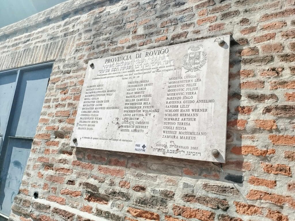 Cimitero ebraico di Rovigo. Ignoti affiggono sulla targa che ricorda gli ebrei uccisi nei campi di sterminio un adesivo con la scritta «Free Palestine» accompagnata dalla croce celtica, simbolo del neofascismo italiano.