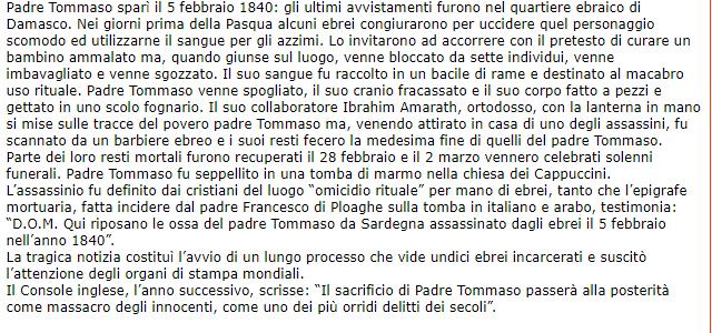 Santi, Beati e Testimoni è un grande sito web dedicato principalmente al culto dei santi cristiani, in esso sono presenti centinaia di biografie tra cui quelle di alcuni santi e beati, che la tradizione cristiana voleva immolati dagli ebrei “in odio a Cristo”, e il cui culto è stato abolito dopo il Concilio Vaticano II nel 1965: Simone da Trento, Lorenzino da Marostica, padre Tommaso da Calangianus. A proposito di quest’ultimo si legge: « Padre Tommaso sparì il 5 febbraio 1840: gli ultimi avvistamenti furono nel quartiere ebraico di Damasco. Nei giorni prima della Pasqua alcuni ebrei congiurarono per uccidere quel personaggio scomodo ed utilizzarne il sangue per gli azzimi. Lo invitarono ad accorrere con il pretesto di curare un bambino ammalato ma, quando giunse sul luogo, venne bloccato da sette individui, venne imbavagliato e venne sgozzato. Il suo sangue fu raccolto in un bacile di rame e destinato al macabro uso rituale. Padre Tommaso venne spogliato, il suo cranio fracassato e il suo corpo fatto a pezzi e gettato in uno scolo fognario. Il suo collaboratore Ibrahim Amarath, ortodosso, con la lanterna in mano si mise sulle tracce del povero padre Tommaso ma, venendo attirato in casa di uno degli assassini, fu scannato da un barbiere ebreo e i suoi resti fecero la medesima fine di quelli del padre Tommaso.  Parte dei loro resti mortali furono recuperati il 28 febbraio e il 2 marzo vennero celebrati solenni funerali. Padre Tommaso fu seppellito in una tomba di marmo nella chiesa dei Cappuccini.  L’assassinio fu definito dai cristiani del luogo “omicidio rituale” per mano di ebrei, tanto che l’epigrafe mortuaria, fatta incidere dal padre Francesco di Ploaghe sulla tomba in italiano e arabo, testimonia: “D.O.M. Qui riposano le ossa del padre Tommaso da Sardegna assassinato dagli ebrei il 5 febbraio nell’anno 1840”. La tragica notizia costituì l’avvio di un lungo processo che vide undici ebrei incarcerati e suscitò l’attenzione degli organi di stampa mondiali. Il Console inglese, l’anno successivo, scrisse: “Il sacrificio di Padre Tommaso passerà alla posterità come massacro degli innocenti, come uno dei più orridi delitti dei secoli”.»