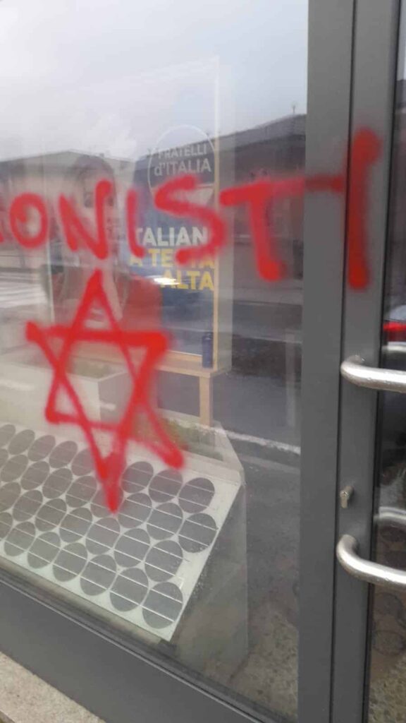 L’associazione Italia Israele Bergamo vuole esprimere solidarietà alla sezione di Fratelli d’Italia di Sant’Omobono Terme imbrattata nottetempo da mani ignote. Sulle vetrine è comparsa la scritta “SIONISTI” accompagnata dalla Stella di David.