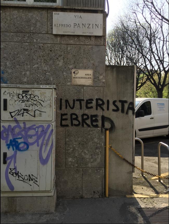 Milano. In via Alfredo Panzini è stata vergata con vernice nera la scritta: “Interista ebreo”.