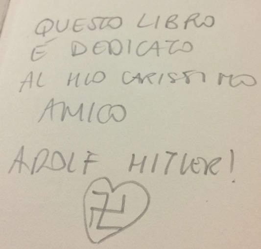 La frequentatrice di una biblioteca comunale di Milano, sfoglia un libro in esposizione dedicato alla Shoah e in prima pagina trova la scritta: “Questo libro è dedicato al mio carissimo amico Adolf Hitler“, con disegnata una svastica all’interno di un cuore.