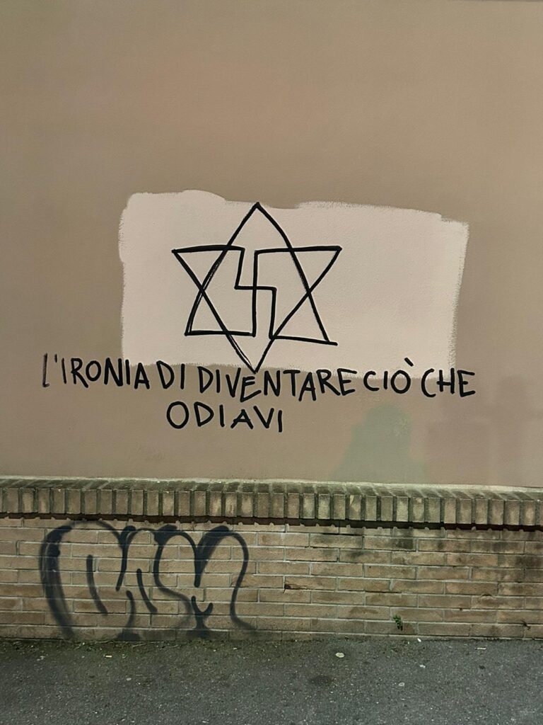 Una immagine che fonde una svastica con una stella di Davide, accompagnata dalla scritta “L’ironia di diventare ciò che odiavi”.