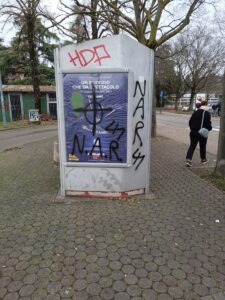 Croci celtiche, svastiche, alcune scritte che inneggiano alle SS hitleriane ed ai Nar, i Nuclei Armati Rivoluzionari, organizzazione terroristica neofascista.