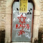 Il percorso delle scritte antisemite inizia da via S. Benedetto, che immette in via dell’Olmo Perino, dove un arco medievale ricorda l’ingresso libero alla sede della comunità ebraica, mai ghettizzata durante i suoi quindici secoli di vita a Fondi. Le scritte si intensificano mano a mano che ci si avvicina alla casa degli spiriti, l’antica sinagoga, e alle case sul cortile, dove le vernici rosse e nere hanno coperto il termine ebraico sul cartello turistico e oscurato le tavole della legge sul cancello d’ingresso.