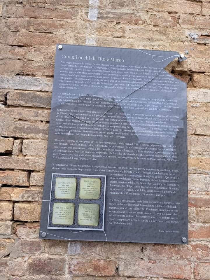 famiglia Grauer: Samuele Graure e Rosa Jordan con i piccoli Marco, nato a Trieste il 6.2.1940 e Tito, nato a Lanciano presso l’ospedale civile Renzetti il 4.2.1942. Una triste storia di una famiglia -prosegue – costretta a essere raminga da Danzica a Trieste a causa delle leggi razziali. Umiliati, internati costretti a subire fame e freddo. Dopo un lungo peregrinare giungono a Orsogna a settembre 1940 Samuel e a novembre Rosa e Marco. Da Orsogna a Castelfrentano vengono arrestati il 2 novembre 1943 anche il piccolo Tito nato a Lanciano. Da Chieti all’Aquila di nuovi arrestati e portati a Bagno di Rivoli il 15 gennaio 1944. Dopo 5 giorni presi dal comando germanico e rinchiusi a San Vittore, Milano. Il 30 gennaio dalla stazione di Milano il convoglio Rshan 6 trasporta sul binario 21 605 ebrei. Fra loro la tredicenne Liliana Segre, e tutta la famiglia Grauer. Destinazione il campo di sterminio auschwitz – birkneau. La selezione è spietata 477 sono inviati subito alle camere a gas e ai forni creatori. Fra questi anche il piccolo Tito che il 2.2.1944 aveva compiuto due anni e Marco ucciso insieme al fratellino il giorno del suo compleanno. Il 6.2.1944”.