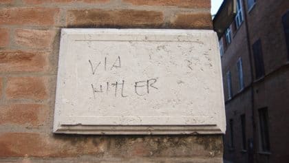 Stampa 21 Dicembre 2017 Sfregio nazista nei pressi dell’antico Ghetto di Ferrara Luogo: Ferrara Fonte: www.estense.com “Via Hitler” L’insegna di Via Voltapaletto, nei pressi dell’antico Ghetto di Ferrara, è stata sfregiata da un ignoto vandalo con la scritta “Via Hitler”.