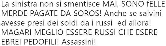 K pubblica a getto continuo tweet dai contenuti antisemiti, complottisti e razzisti. Bersaglio principale delle sue invettive il finanziere statunitense George Soros, imputato di vari complotti e malefatte, a cui contrappone in chiave di bene il presidente russo Putin. K è una simpatizzante leghista e condisce questa sua militanza con molteplici insulti contro gli ebrei, irrisi in modo pesante. Frequenti anche gli insulti razzisti inseriti in una dimensione di demonizzazione degli immigrati.