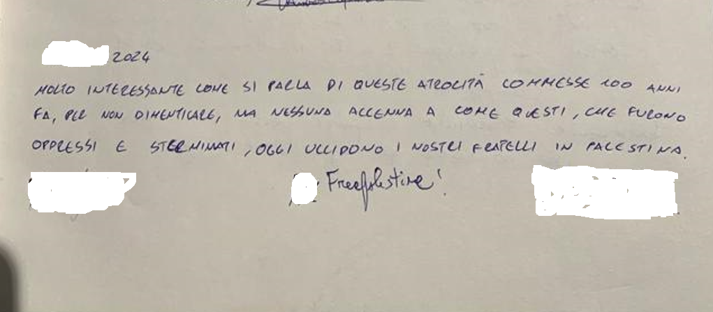 Milano, simpatizzanti pro pal scrivono messaggi antisemiti sul libro delle firme di una mostra dedicata all’espulsione dei docenti ebrei dalle scuole italiane nel 1938. Le frasi, ispirate al conflitto tra Hamas ed Israele, accusano gli ebrei di comportarsi come i nazisti.