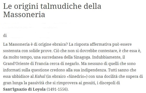 Stampa 21 Gennaio 2019 Sito web antisemita Fonte: Segnalazione “Le origini talmudiche della massoneria” Sito web complottista con circa 25 mila contatti quotidiani, ogni giorno pubblica articoli originali che attingono alle principali accuse contro gli ebrei.
