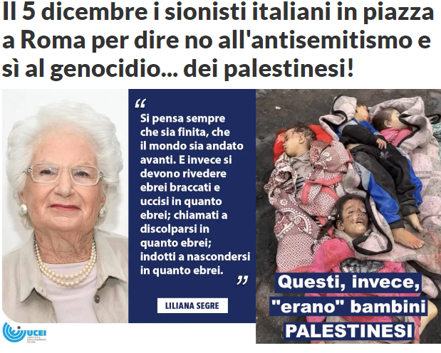“i sionisti italiani che, facendosi scudo del vittimismo legato al cosiddetto antisemitismo…cercano di calare un velo sul genocidio messo in atto a Gaza e nei Territori occupati ad opera dei sionisti israeliani…”