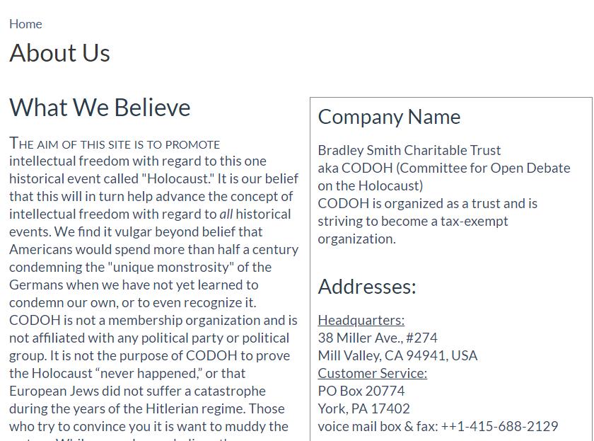 CODOH è uno dei principali siti web dedicati alla diffusione della negazione della Shoah, la lingua principale è l’inglese ma ci sono anche molti documenti in italiano. CODOH non è solo negazionista ma anche un enorme contenitore di materiale antisemita multimediale.