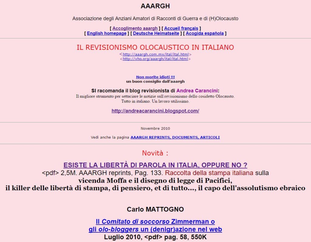 Associazione degli Anziani Amatori di Racconti di Guerra e di (H)Olocausto – AAARGH, pagina italiana di uno dei principali siti negazionisti nel mondo
