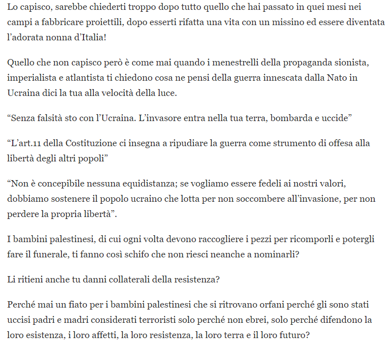 Influencer che negli ultimi anni si è progressivamente trasformato in un attivista dell’antisemitismo legato alla polemica contro il “sionismo”, scrive per un sito web di informazione una lunga intemerata contro Liliana Segre e la comunità ebraica italiana.