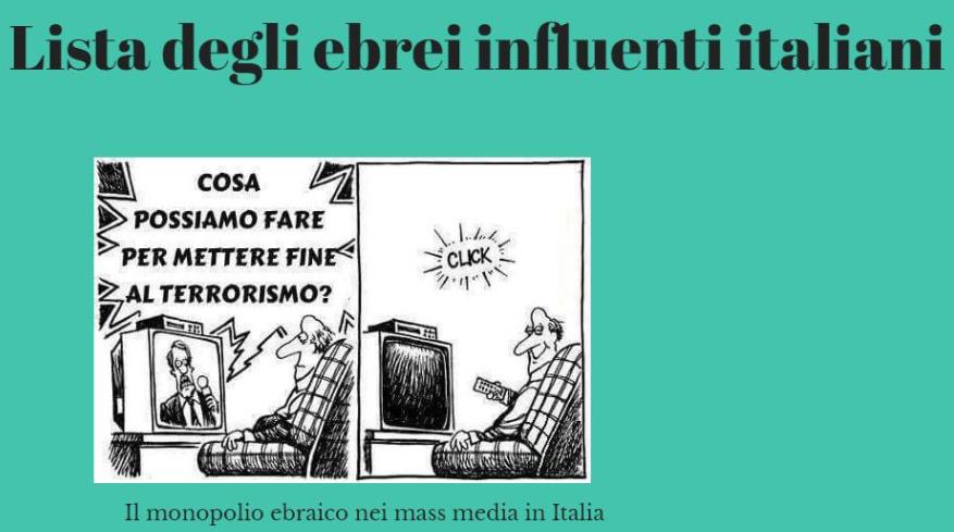 Sito web dedicato a ”Informazioni, storia, medicina, salute,massoneria, sionismo, politica, alimentazione, sociale, vaccini, moneta” diffonde teorie cospirative spesso intrise di elementi di antisemitismo, in una page ospita un vecchio elenco di ebrei o presunti tali che dominerebbero e governerebbero il mondo dell’informazione italiano.