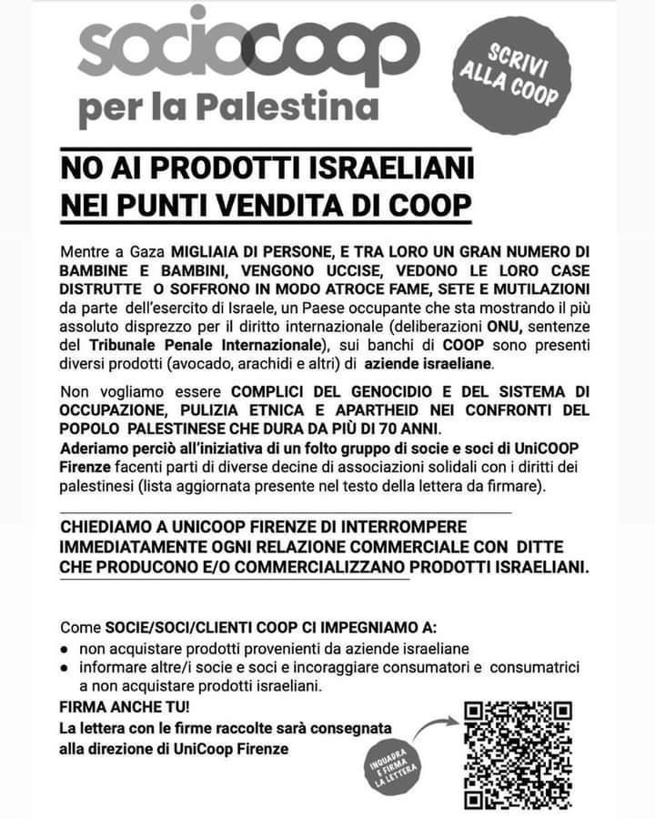Così recita un manifesto che gira in questi giorni. “Come socie/soci/clienti Coop ci impegniamo a non acquistare prodotti provenienti da aziende israeliane, a informare altri e incoraggiare consumatori e consumatrici a non acquistare prodotti israeliani”. C’è anche il Qr code. Un invito a fare pressione sulla Coop perché smetta di vendere prodotti dallo stato ebraico. Un mezzo di pressione per non comprarle. Il Wall Street Journal scriveva tempo fa che si è passati “dallo Judenfrei (nazista) allo Zionistfrei (antisionista)”.