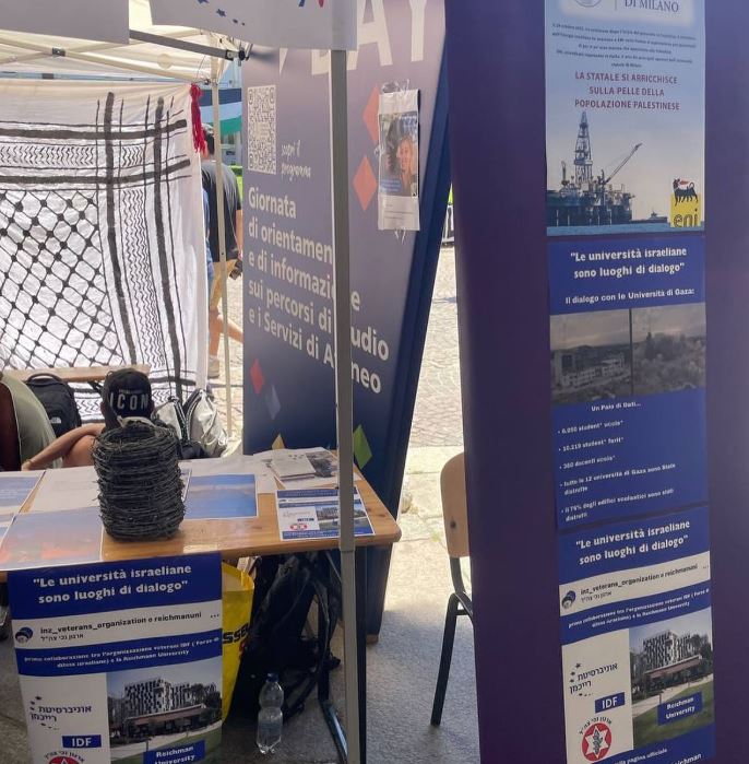 “Oggi nell’università statale di Milano si è tenuto l’open day. Le varie facoltà si sono presentate alle future matricole pubblicizzandosi come “inclusive” e con svariati sbocchi professionali, dimenticando però che gran parte dei tirocini offerti sono sottopagati o gratuiti, presso aziende tra le più inquinanti al mondo, come Eni, o che producono armi da guerra, che vengono quotidianamente utilizzate per massacrare civili inermi, come Leonardo spa.