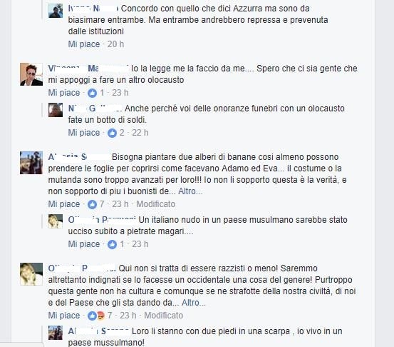 «Bisogna piantare due alberi di banane cosi almeno possono prendere le foglie per coprirsi come facevano Adamo ed Eva… il costume o la mutanda sono troppo avanzati per loro!!! Io non li sopporto questa è la verità, e non sopporto di piu i buonisti del cavolo … che non capiscono nulla e parlano a vanvera!!! li rimpatrierei subito sti quattro zulù!!!Se fosse stato un italiano nudo »