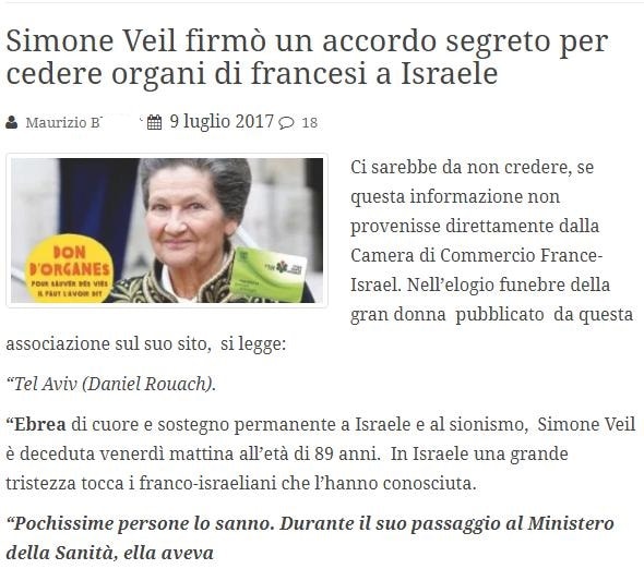 Il 9 luglio, in occasione della morte della francese Simon Veil è ritornato sul topos antisemita degli ebrei ladri di organi con l’articolo “Simon Veil firmò un accordo segreto per cedere organi di francesi in Israele”.
