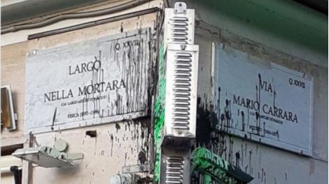 Roma, largo Nella Mortara, imbrattate targhe toponomastiche in memoria di vittime delle leggi razziste che hanno sostituito targhe in memoria di firmatari delle leggi stesse.