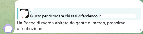 Utente Telegram definisce lo stato di Israele un paese di me…abitato da gente di me…e prossimo all’estinzione, ad un altro internauta che gli replica: la gente di Israele non è prossima all’estinzione, chiosa: verranno sterminati tutti.