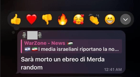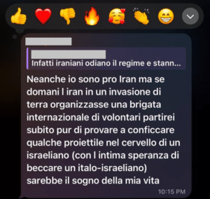 Così utenti Telegram commentano alcune notizie sulla guerra – tra cui quella sulla morte di un soldato israeliano su Telegram, con insulti verso utenti che rispondono commentando le notizie politiche. Un utente scrive che si arruolerebbe immediatamente per poter “conficcare qualche proiettile nel cervello di un soldato israeliano”, ancora meglio se italo-israeliano (sarebbe il sogno della sua vita).