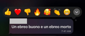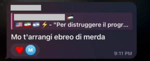 “Spero gli taglino la gola a questo porco ebreo”, “Un ebreo buono è un ebreo morto”, “mo t’arrangi ebreo di merda”, “Sarà morto un altro ebreo di merda”, “Drogati di meno viscido ebreo”, “Ebreo di merda”