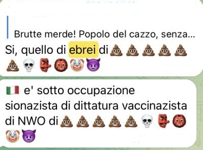 Gruppo Telegram antivaccinista con circa 14mila iscritti posta messaggi che legano antivaccinismo, teorie della cospirazione e molteplici forme di – esplicito – antisemitismo, in questi post ebrei o presunti tali vengono demonizzati secondo tutti i miti di accusa dell’archivio giudeofobico.
