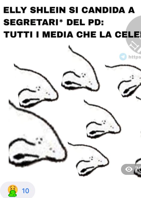 Profilo Telegram di estrema destra che ha come avatar un manganello in stile fascista, posta immagini e frasi che si fanno beffe e inneggiano alla violenza contro gli ebrei. Una delle principali vittime è la deputata del PD Elly Schlein, sbertucciata come “ebrea nasona”.