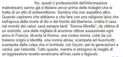 «se muore un cittadino di religione ebraica e si grida all’antisemitismo, gli unici a cui questo omicidio appare funzionale saranno i nazionalisti ebrei… E siccome sono pazzi… Non vorrei assistere in futuro ad un aumento di morti violente di cittadini di religione ebraica.»