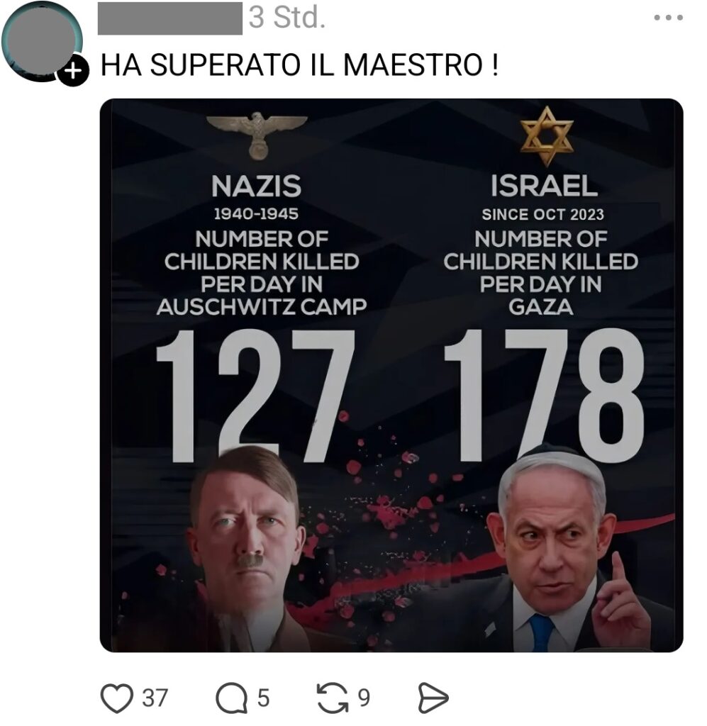Stampa 25 Ottobre 2025 Threads, profilo pubblica contenuto antisemita Luogo: Threads Fonte: Segnalazione “HA SUPERATO IL MAESTRO” Immagine pubblicata da un utente paragona Israele al regime nazista.