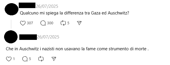 Alla domanda “Qualcuno mi spiega la differenza tra Gaza e Auschwitz?”, utente risponde: “Che in Auschwitz i nazisti non usavano la fame come strumento di morte”. Il commento è antisemita perché banalizza e distorce la Shoah, paragonando la situazione a Gaza con Auschwitz — un luogo simbolo dello sterminio sistematico di milioni di ebrei.