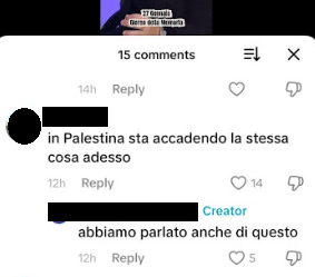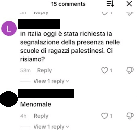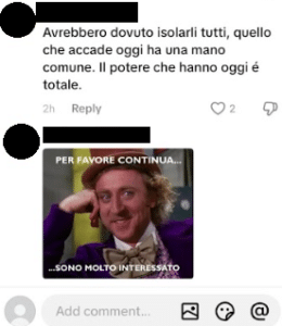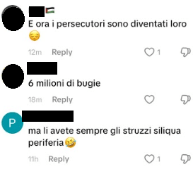“Avrebbero dovuto isolarli tutti […] Il potere che hanno oggi è totale” “6 milioni di bugie” “E ora i persecutori sono diventati loro” “Menomale” “In palestina oggi sta accadendo la stessa cosa”