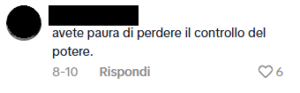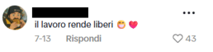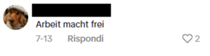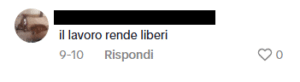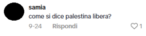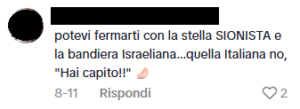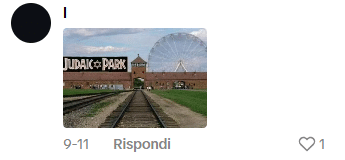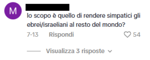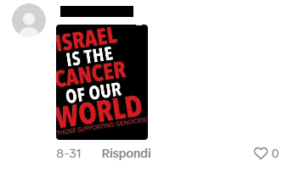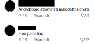 Una ragazza ebrea ha pubblicato un video su TikTok dove insegna alcuni modi di dire in ebraico. Alcuni utenti di TikTok le scrivono commenti antisemiti di vari matrici ideologiche, come “il lavoro rende liberi”, “avete paura di perdere il controllo del potere”, “88” (che sta per HH, “Heil Hitler”), “Andrebbero sterminati maledetti sionisti”, “free palestine”, “Israel is the cancer of the world”, “potevi fermarti con la stella SIONISTA […]” e altri messaggi che celebrano lo sterminio nazista, oltre che bandiere palestinesi.