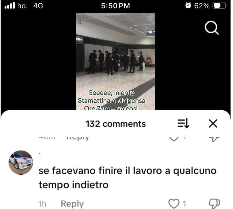 Stampa 19 Marzo 2026 TikTok, commenti brutalmente antisemiti Fonte: Segnalazione CE «La razza eletta…scarfaggi» TikTok, video mostra degli ebrei religiosi in preghiera all’aeroporto di Malpensa, seguono moltissimi commenti brutalmente antisemiti che inneggiano ad Hitler e allo sterminio degli ebrei.