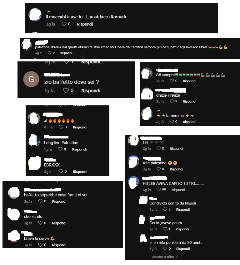 I tifosi della Fiorentina hanno cantato “Odio Israele” durante la partita di calcio contro il Maccabi. Su TikTok viene diffuso un video del coro e nei commenti molti utenti citano Hitler ed il suo mancato completamento di sterminio degli ebrei.