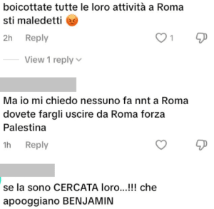 “Se la sono CERCATA loro…” “Cari sionisti la carta della vittima non potete più giocarla”, “fuori da Roma”, “chi è causa del suo mal… (pianga se stesso)”, “quanto mi dispiace… (tono ironico)”, “Giusto”