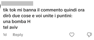 Stampa 10 Giugno 2025 TikTok, profilo incita a lanciare una bomba H su Tel Aviv Luogo: TikTok Fonte: Segnalazione Profilo falso incita alla violenza contro gli ebrei.