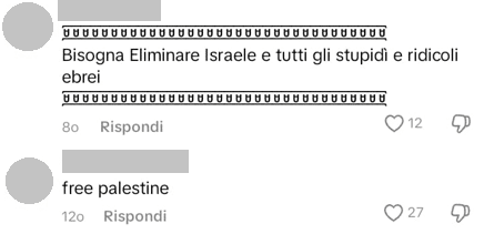 Stampa 17 Luglio 2025 TikTok, utente incita allo sterminio degli ebrei Luogo: TikTok Fonte: Segnalazione Utente TikTok commenta “bisogna eliminare Israele e tutti gli stupidi e ridicoli ebrei”.