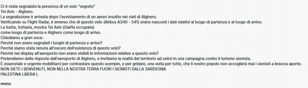 “NON SIETE I BENVENUTI FUORI I SIONISTI DALLA SARDEGNA”