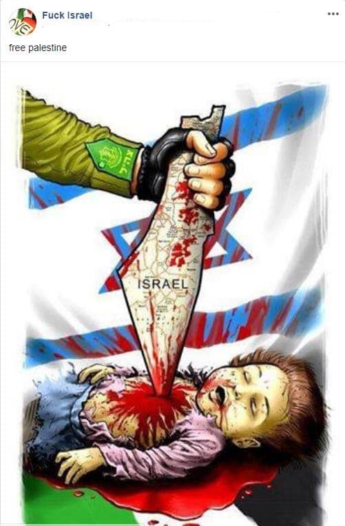 Le community Facebook antisioniste in inglese sono numerose, tra le tante: Jerusalem “Al-Quds” is the Capital of Palestine, Fuck Israel, Free Palestine che hanno, rispettivamente, 33mila, 51mila, e 143mila followers, l’ideologia antisionista che anima queste pages emerge chiaramente anche dai nomi, spesso irridenti e triviali. Queste tre community sono sostanzialmente speculari, basate su rozzi dettami propagandistici ed un manicheismo privo di sfumature che tende a dipingere i “sionisti” come depositari di un male archetipico e gli arabo-palestinesi in qualità di bene assoluto, questo dualismo si esprime principalmente attraverso fotomontaggi (categorizzati come Face Off) che ritraggono i “sionisti” – di volta in volta soldati o ebrei religiosi con abiti neri – opposti a fieri palestinesi, la contrapposizione risalta nettamente anche da un profilo estetico, mentre i “sionisti” sono irreparabilmente brutti e ridicoli, i palestinesi sono invece belli e coraggiosi, ed i loro morti sempre e solo “martiri”. I soldati di “Israhell” vengono rappresentati in modo binario, o truci guerrieri torturatori di infanti arabi oppure tremebondi minus habens incontinenti e perciò forniti di pannolone, la mostrificazione di “Israhell” e dei “sionisti“ si spinge sino a forme di biologismo ed atavismo. Nelle tre community è frequente anche l’impiego di fotografie che ritraggono bimbi palestinesi sorridenti, in pose marziali, ovvero brutalizzati dai “sionisti”, di video contenenti “immagini forti o violente” (e quindi talvolta ‘bloccate’ dal provider), vignette truculente e demonizzanti. Anche il lessico usato dai followers è violento tanto quanto l’iconografia impiegata e spesso volgare, ossessivo l’impiego di lemmi quali : fuck, assholes, butthart, applicati ai “sionisti”.