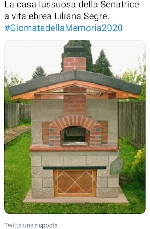 Utente fake di Twitter nei giorni precedenti il Giorno della 2020 pubblica insulti antisemiti contro Liliana Segre tra cui un post dove viene raffigurato un forno a legna da esterno definito come la “lussuosa casa” della senatrice sopravvissuta al campo di sterminio di Auschwitz.