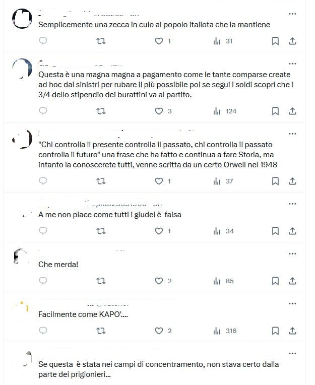 Account Twitter di persona no vax, filo Putin e vicina ad ambienti della destra antidemocratica, posta un video infamante contro Liliana Segre, tacciata d’essere una bugiarda che non è mai stata ad Auschwitz, segue un profluvio di grevi commenti antisemiti e denigratori.