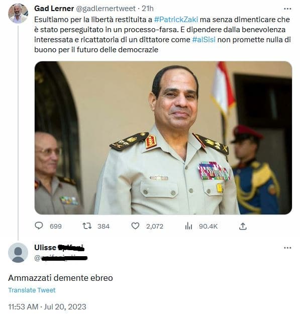 Il giornalista Gad Lerner continua ad essere oggetto di attacchi antisemitici condotti attraverso le maggiori piattaforme sociali. Gli insulti che gli vengono rivolti sono molto aggressivi e, non di rado, ricorrono metafore legate alla Shoah: Ecco alcuni tweet di luglio: sporco ebreo comunista di mer…; ammazzati demente ebreo; devi morire ebreo di mer…;Ebreo non hai diritto di parlare; Ebreo schifoso; ebreo di mer..col rolex; per te dovrebbero riaprire i forni.