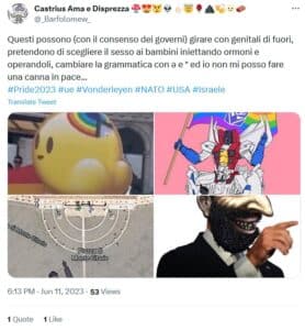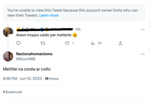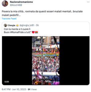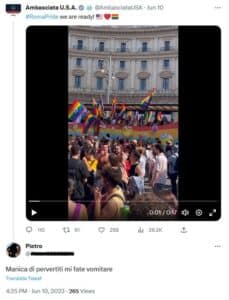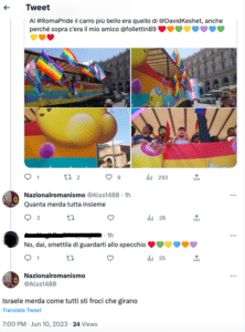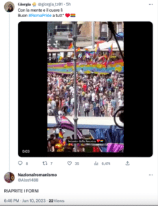 Utenti twitter e simpatizzanti di estrema destra commentano alcuni tweet dedicati al Roma Pride con minacce e insulti che mescolano omofobia e antisemitismo. Ecco alcuni esempi: mettite na corda ar collo, vomito, mer…, impiccate, attenti a voi fr…di me…,bruciate malati pedofili, riaprite i forni.