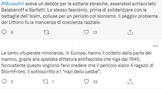 Apologeta del razzismo e dell’antisemitismo più beceri, usa il suo profilo Twitter per insultare e schernire minoranze, donne, omosessuali, neri, etc. . I suoi post, spesso segnalati al provider da molti utenti offesi dal loro contenuto di estremo razzismo, non vengono quasi mai eliminati.