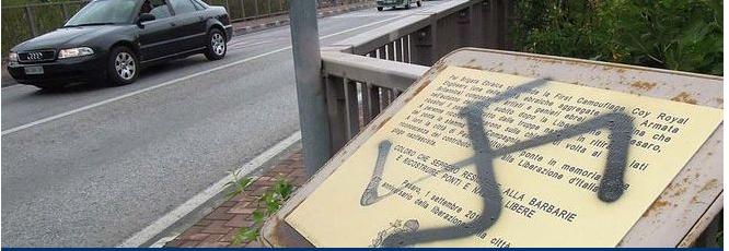 Nel giorno in cui la città di Pesaro celebrava il 70esimo anniversario della sua Liberazione dall’occupazione nazifascista, ignoti hanno disegnato una svastica con vernice spray nera sulla lapide dedicata al ponte che dalla Statale collega via Mameli scavalcando il Foglia. Ponte che dal 2 settembre 2011 (67esimo anniversario) la città ha intitolato ai genieri della Brigata Ebraica arruolati nella V Armata del generale Alexander che nel 1944 lo ricostruirono a tempo di record.